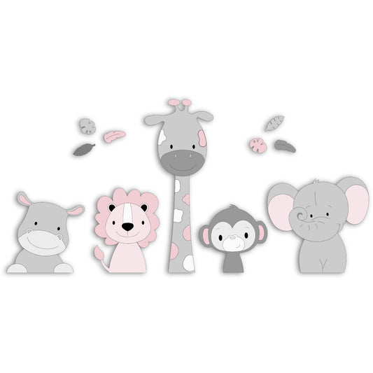 Houten muursticker - 5 Jungle dieren nijlpaard, leeuw, giraf, aap, olifant - grijs (bladeren optioneel) (115x55cm)