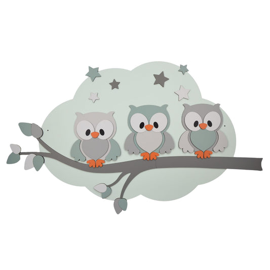 Houten muurdecoratie - 3 Bosuiltjes op tak met sterren op wolk - kleur te kiezen (100x60cm)