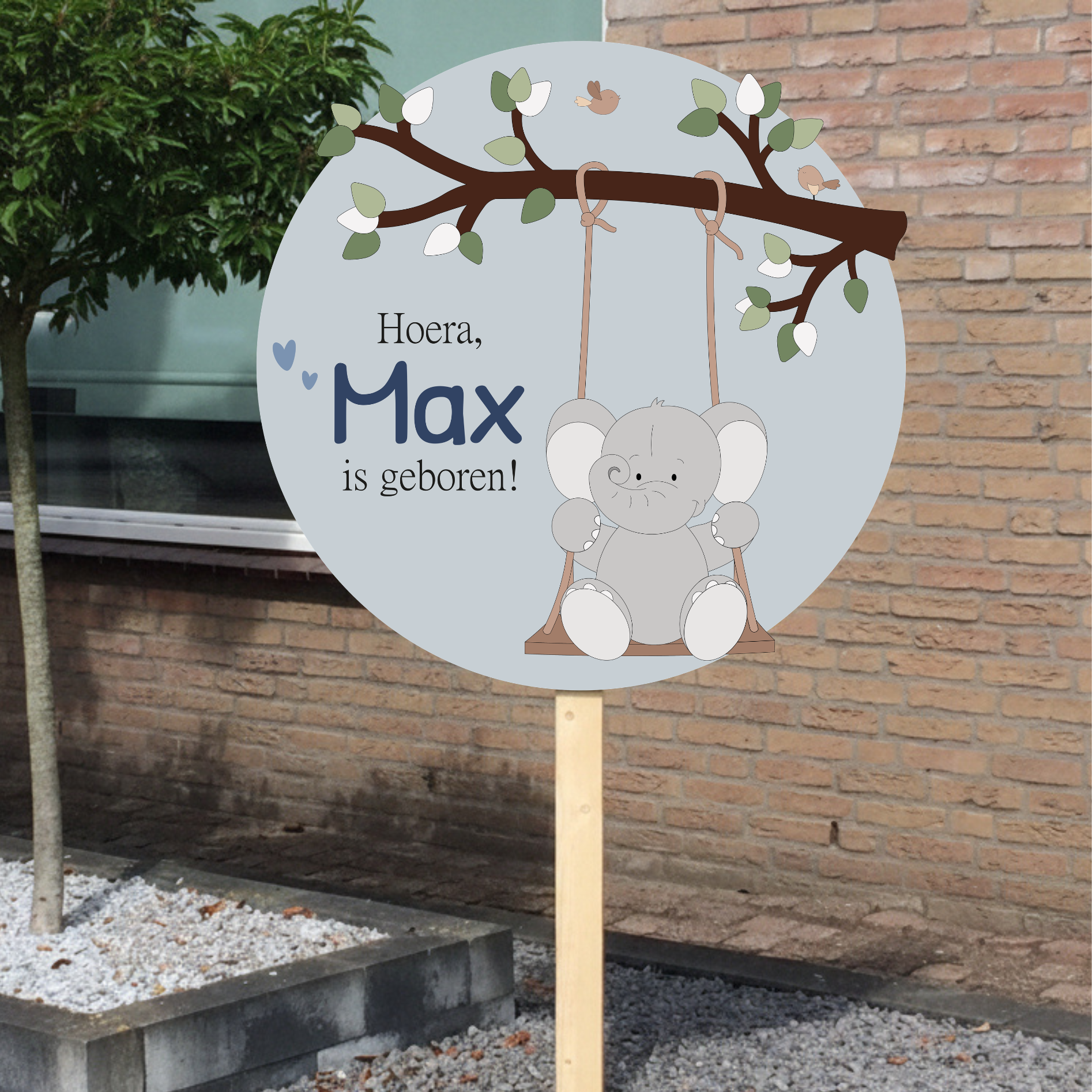 Geboortebord tuin - tak met schommelend olifant - kleur te kiezen (Ø60cm)